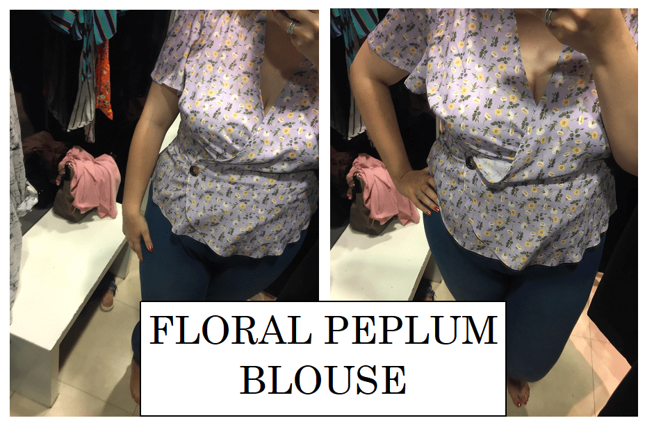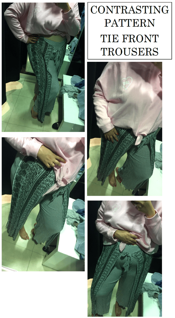 But I am in love with these trousers. Primark have a whole bunch of these in different colours but something I have learnt over the course of these weeks doing all these undercover shopper esk things is plain block coloured trousers (unless they’re black) do not look good on me. I personally don’t want to wear anything that accentuates how big my tummy is. It is not flat at all my stomach is round and it doesn’t have rolls when you sit down it is just one massive roll. But I’ve found that anything that is a block colour and not patterned just does not look good on my stomach. So I saw this style of trousers around a lot and I really struggle with Primark’s trousers because the majority of them don’t fit right around the crotch area properly. You always get that awkward flap of material that doesn’t know where it is supposed to go. But I tried these on and I fell in love with them. This is another item that I wish I could’ve bought at the time. That top left corner photo, I am living for how slim and flat these make my stomach look. You can’t tell in these trousers because they’re complimenting my figure so well but I assure you my stomach is not flat at all. I am honestly shook at how good these look on my body. I think the contrasting patterns and the tie up front really do me favours here because it gives the eyes something else to focus on other than a specific body part (my stomach).