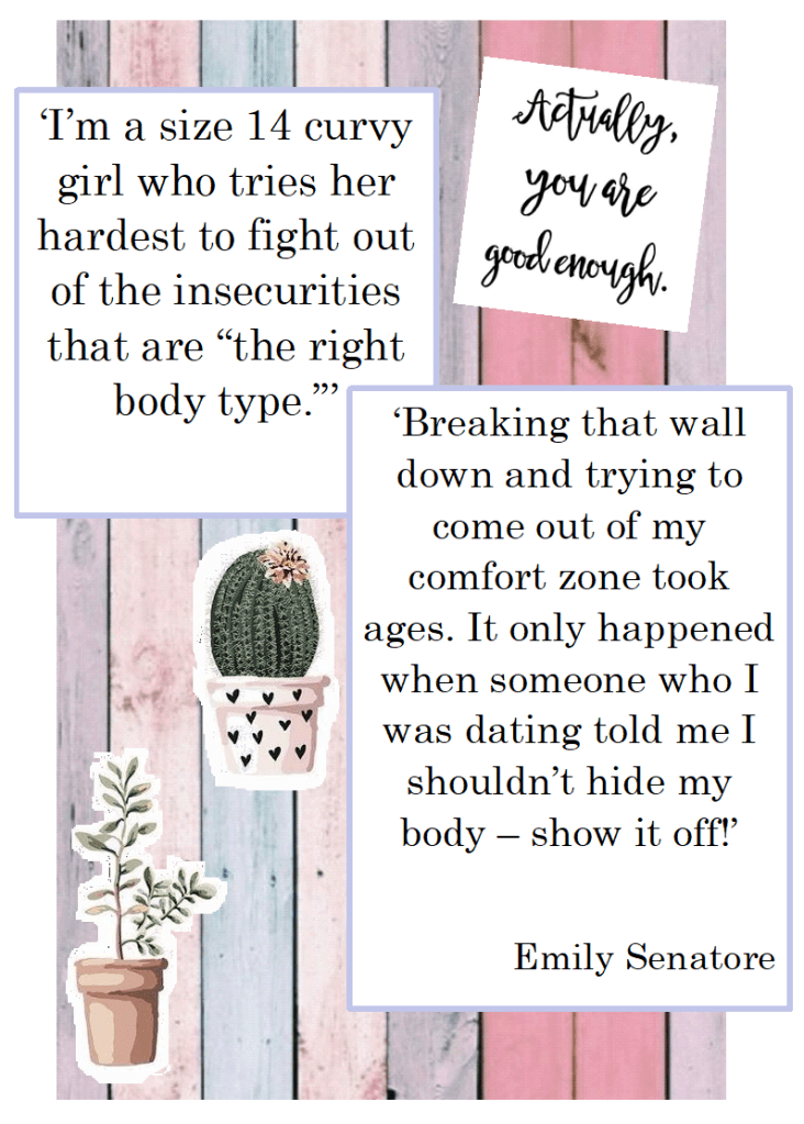 One thing this research does prove is it doesn’t matter whether you’re a size 8 or a size 20 (as all of the women I interviewed range from sizes 8-20) body confidence has nothing to do with weight. Melanie Murphy and Jessica Brennan are two YouTubers and are also sisters who are very real on their channels. They talk about sexuality, anxiety, depression, periods, sex, relationships, confidence, and many other different topics. They have a series they do together called Teenage Vs. Twenty Something where they discuss similar topics as said above but from two different perspectives because they’re quite a few years apart in age. In that series they did a whole video dedicated to body image and body confidence and one thing in particular they debate is how your body confidence does not latch on to your weight.